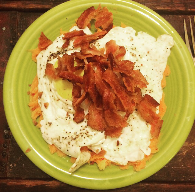 I cooked the sweet potato in the microwave to speed up the process. Crisped the bacon. Fried the eggs, but made sure the yolks stayed a little runny.