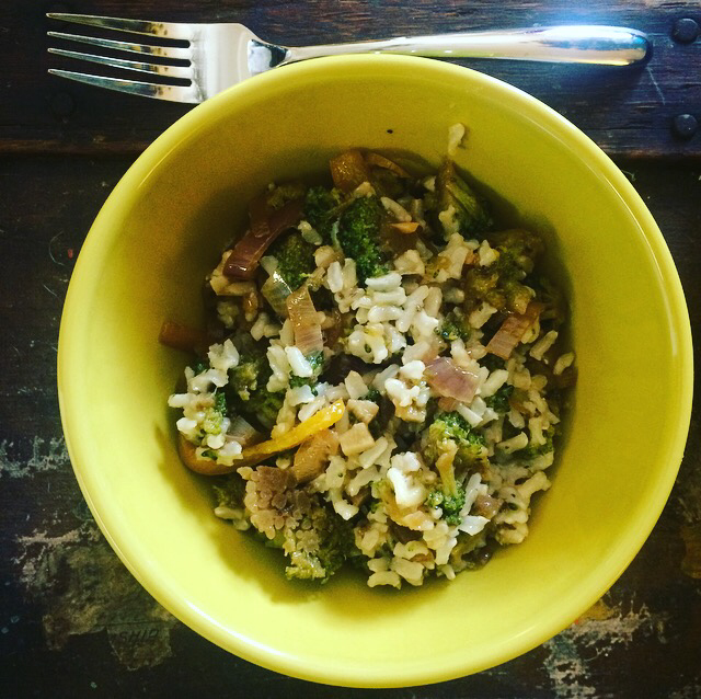 When the rice is cooked, add it to the teriyaki vegetables. Combine and let cook a few minutes if you aren’t overcome with the delicious smell.