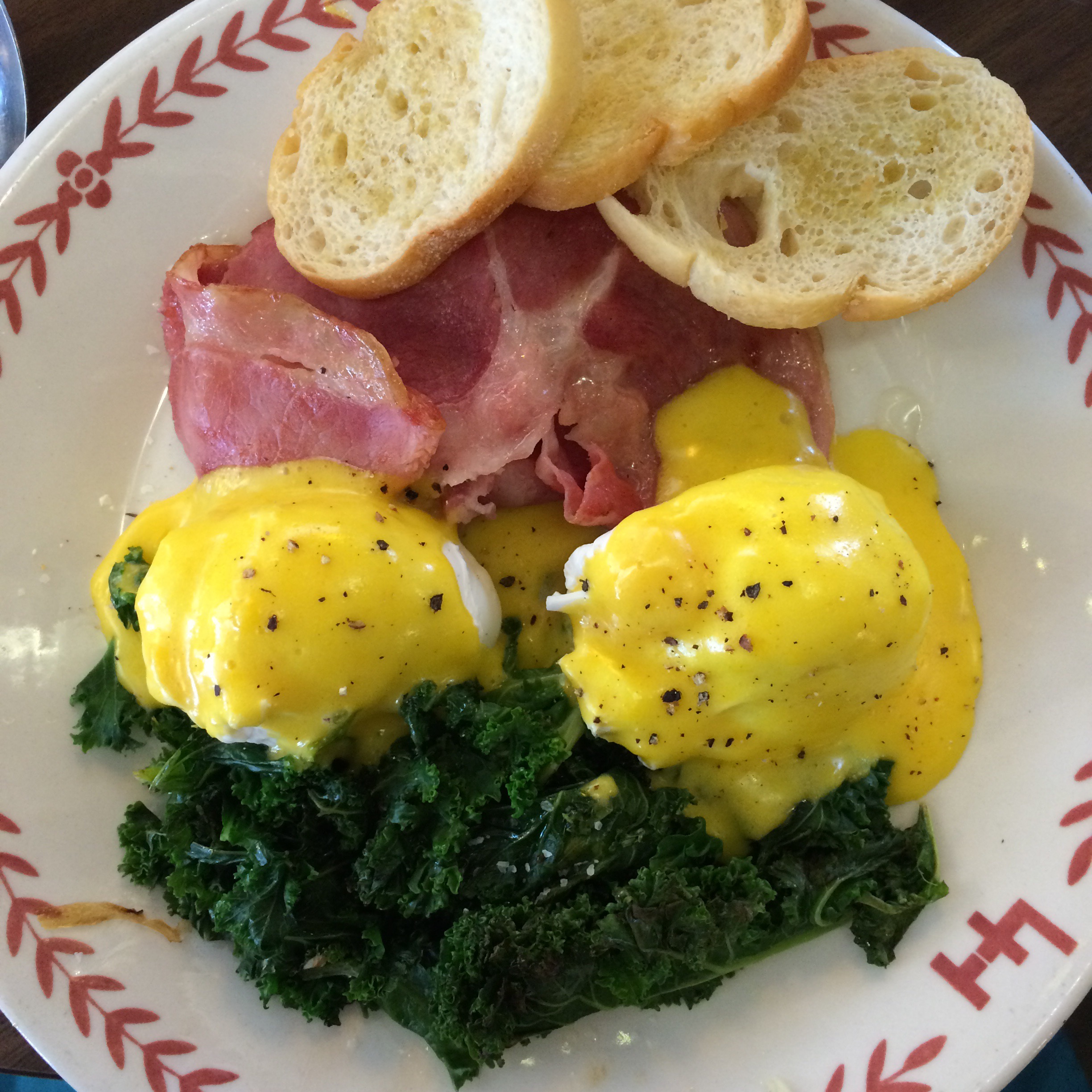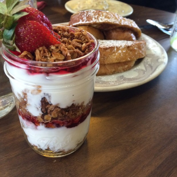 I had the Root Benny. Poached eggs on a bed of local greens with thinly sliced ham and homemade hollandaise sauce. We shared the yogurt parfait and a plate of French toast.