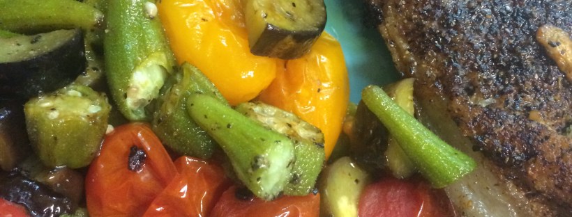 Case-in-point: These roasted chops with okra, Japanese eggplant and baby tomatoes.