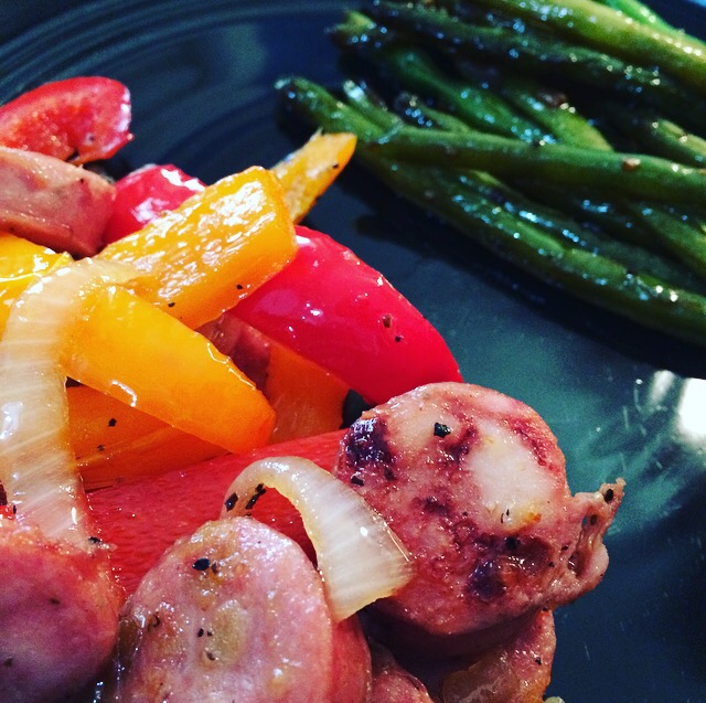 Dinner tonight was a winner.  I found Whole30 compliant chicken sausage at the store. Life. Saver. Especially when I’m in no mood for cooking. I had pre-sliced onions ready to go, and I sliced some wilted bell peppers to add to the mix.