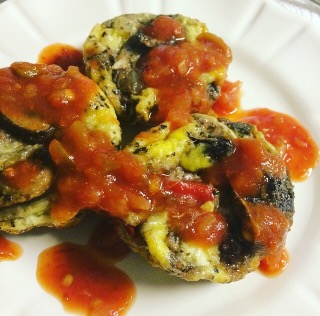 Breakfast today was egg muffins with salsa. I mixed homemade pesto into this batch. Very tasty.