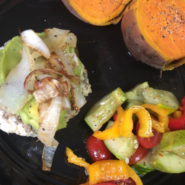 I topped our ranch chicken burgers with guacamole and caramelized onions. I baked some sweet potatoes. And thanks to The Boyfriend’s mom, I have a new favorite summer salad
