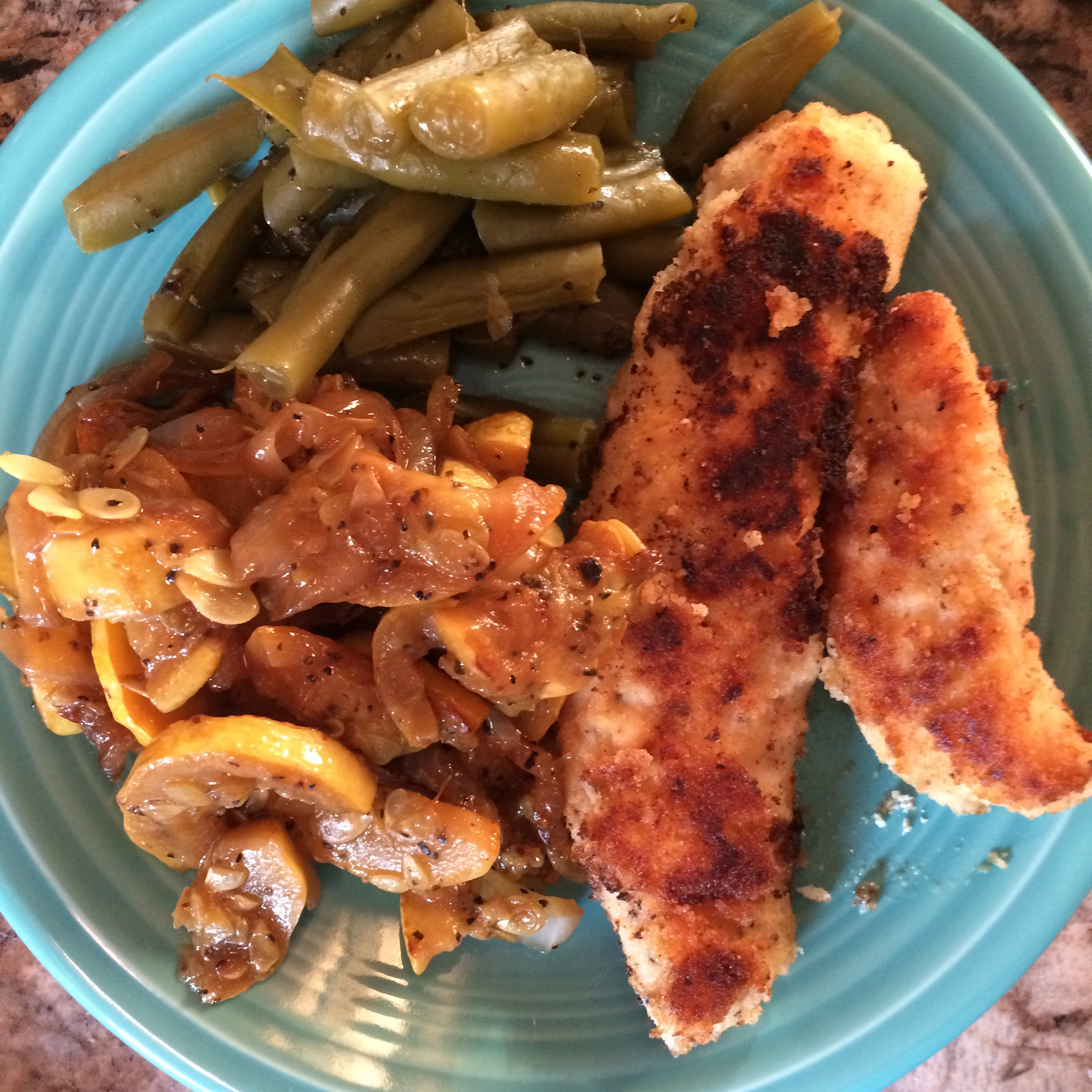 Whole30 Fried Chicken with Squash and Onions and Green Beans.
