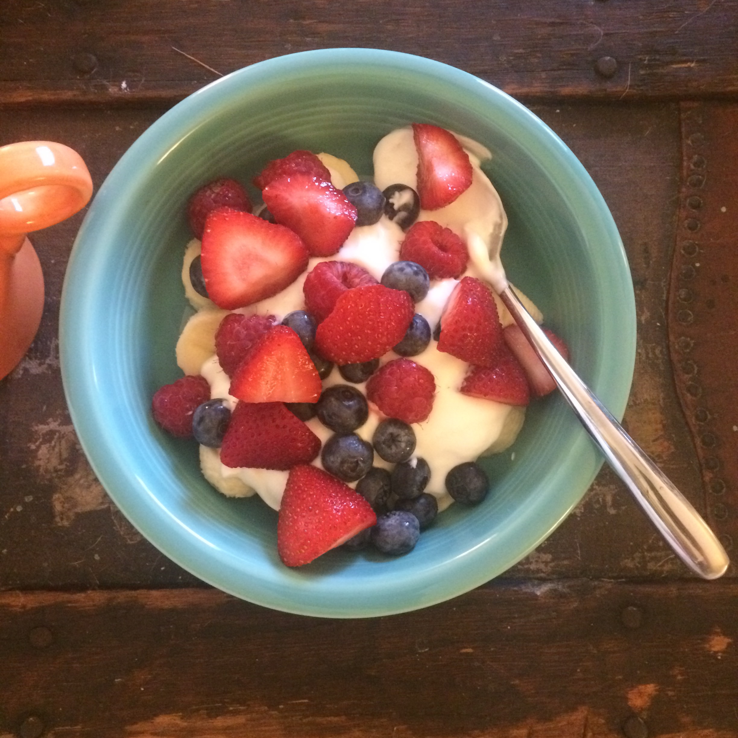 A beach-inspired breakfast bowl. All you need is one sliced up banana, two or three heaping spoonfuls of plain Greek yogurt, handful of raspberries, blueberries and strawberries.