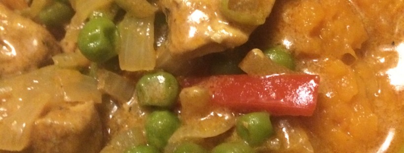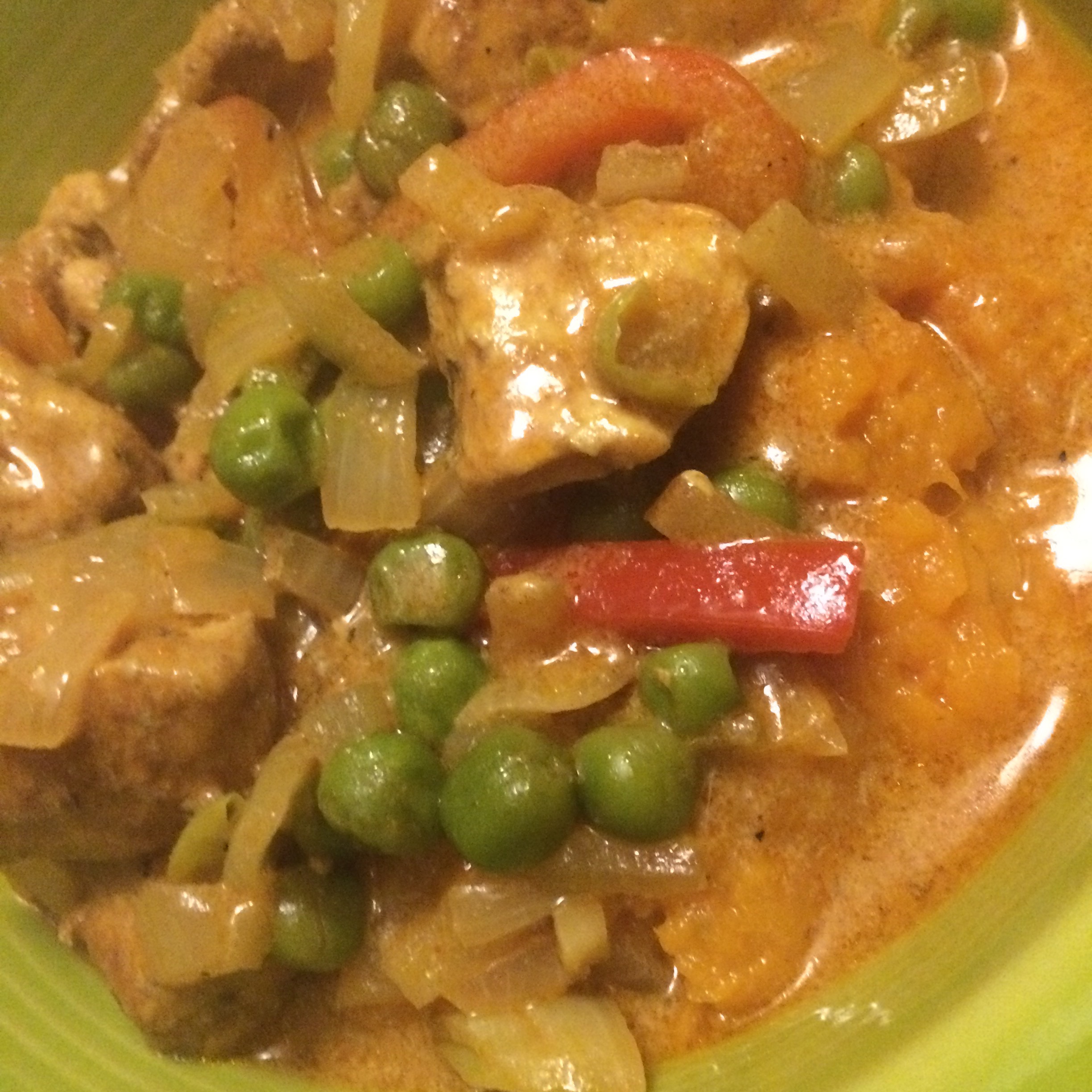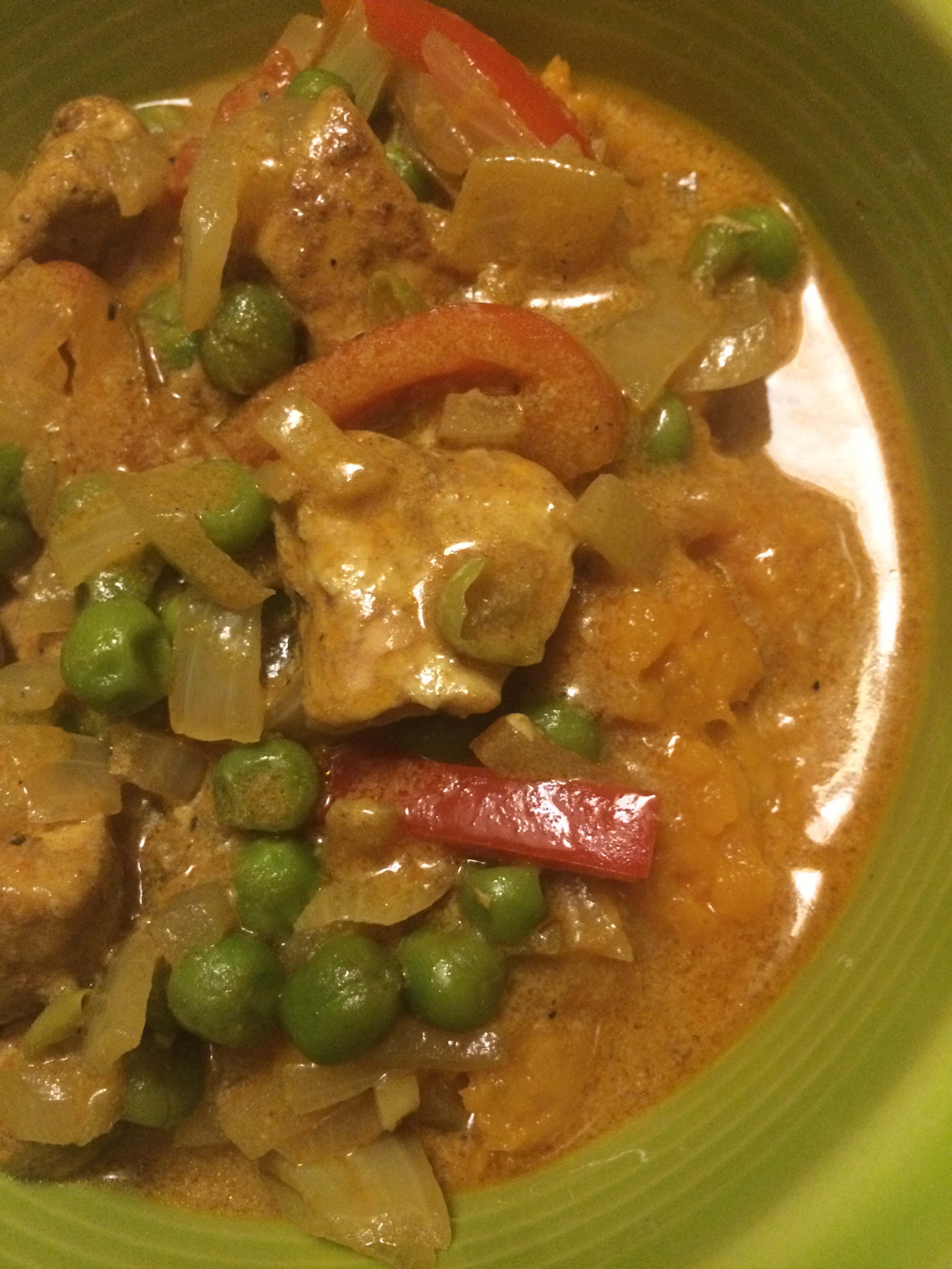 Add the peas and tomatoes to the chicken and onions. Let the peas heat through. Add the coconut milk. Season with a little more salt and pepper and a lot of dill.